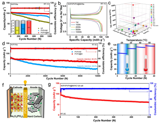 图5. (a)常规电解液,PVFH/M和PVFH@M对应NVP//Na电池的室温循环稳定性对比。PVFH@M对应NVP//Na电池(b)不同圈数的充放电曲线及(c)与已报到文献的性能对比。(d)三种电解质对应NVP//Na电池大倍率(5 C)循环稳定性对比。(e)PVFH@M对应NVP//Na电池不同温度下循环对比。NVP//PVFH@M//HC全电池的(f)结构示意图及(g)循环性能测试。