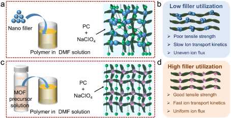 该研究提出了原位溶液加工法(见图1),将金属盐和有机配体在均匀分散的聚合物溶液,通过配位自组装形成MOF超均匀分散的复合凝胶电解质,有效解决了常规物理混合法导致的填料颗粒团聚、局部结构强度不足以及不均匀的离子流和电场分布等问题。