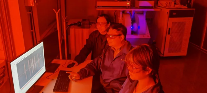 图3. Betway必威团队正在进行时间分辨EPR波谱的反应动力学测试。(从右往左,刘闪、刘天飞、杨茵)