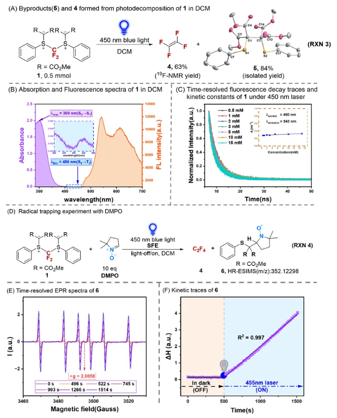 图2. (A) 二氟卡宾双硫叶立德试剂在蓝光下释放二氟卡宾的产物结构确定;(B) 二氟卡宾双硫叶立德试剂的紫外可见光谱和450 nm光激发的荧光激发光谱;(C) 二氟卡宾双硫叶立德试剂在450 nm光激发下的浓度相关荧光动力学轨迹;(D) 二氟卡宾双硫叶立德试剂在蓝光下发生自由基捕获反应;(E) 自由基捕获反应的时间分辨EPR波谱;(F) 自由基捕获反应的时间分辨EPR波谱动力学轨迹。
