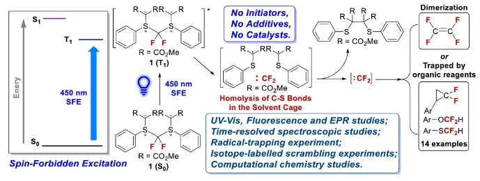 图1. 本工作开发的具有对称性结构的新型固态二氟卡宾前体的结构和通过自旋禁阻激发释放二氟卡宾的新机制。