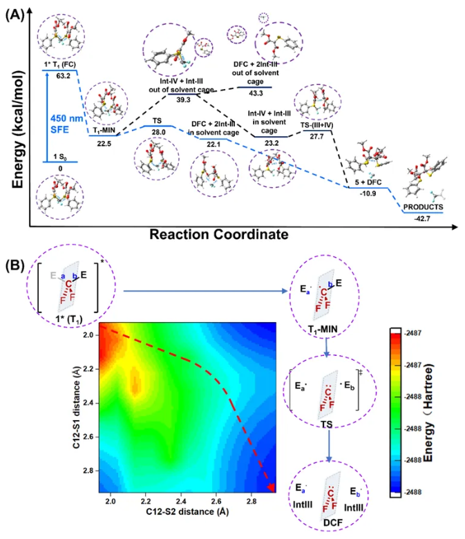 图4. (A) 二氟卡宾双硫叶立德试剂在可见蓝光照射下发生禁阻激发生成二氟卡宾的反应坐标图 (Path B和Path D);(B) 二氟卡宾双硫叶立德试剂在可见蓝光照射下发生禁阻后通过溶剂笼内途径Path B生成二氟卡宾的More O'Ferrall-Jencks图和二维能量图。非协同异步过程为蓝色路线,协同异步过程为红色虚线路线。