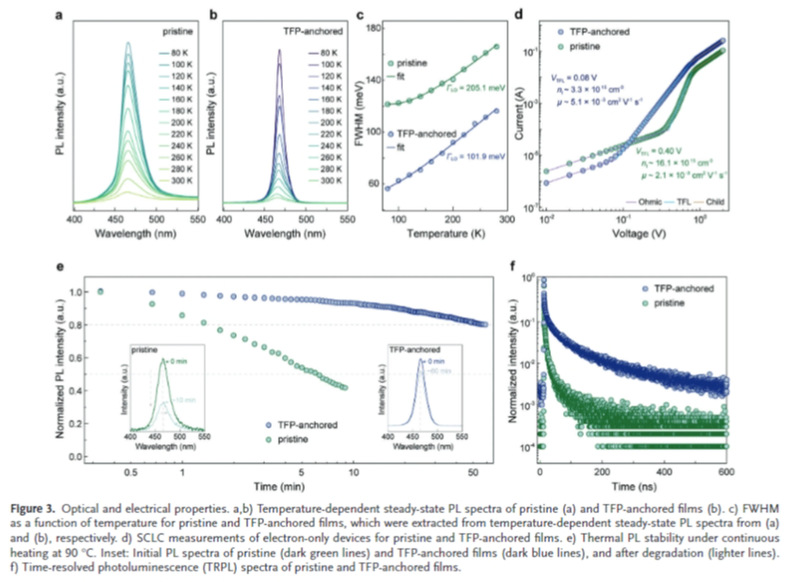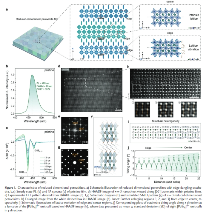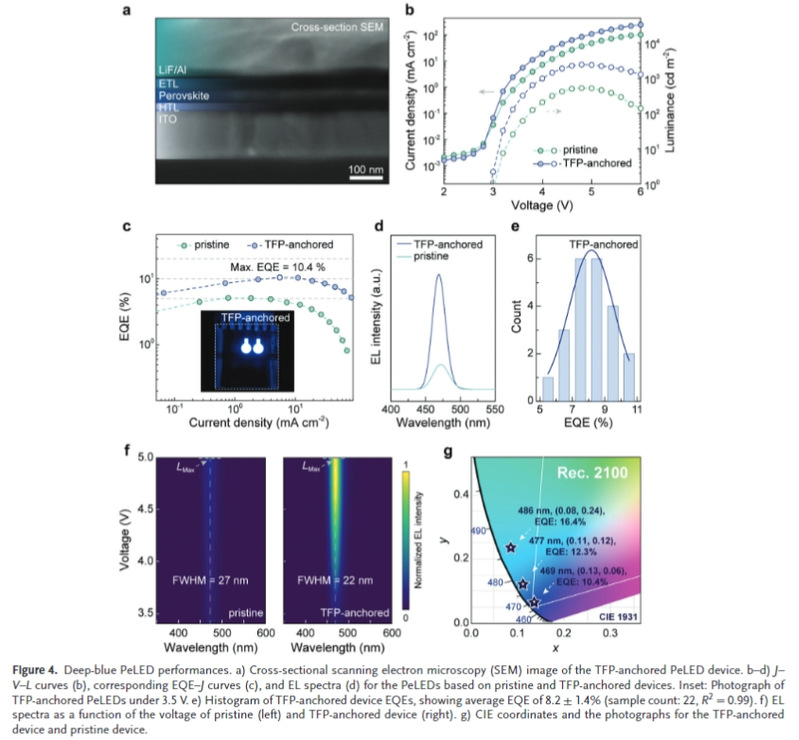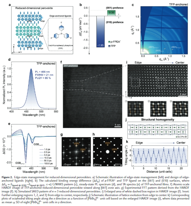 Betway必威袁明鉴、姜源植等人报告了一种通过引入三(4-氟苯基)膦(TFP)配体来管理边缘态晶格的方法。由于三(4-氟苯基)膦配体具有较大的立体阻碍以及与边缘八面体的强结合亲和力,边缘八面体倾斜重构能有效抑制晶格振动并抑制 EP 耦合。这种策略可产生深蓝色发光薄膜,其光谱线宽为 21 nm,在低激发密度下的光量子产率为 85%。由此产生的 PeLED 在 469 纳米波长处实现深蓝色发射,最大亮度为 2428 cd m-2,最大外部量子效率为 10.4%,是目前报道的效率最高的深蓝色 PeLED 之一。