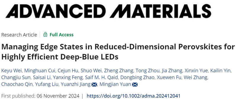 K. Wei, M. Cui, C. Hu, S. Wei, Z. Zhang, T. Zhou, J. Zhang, X. Yue, K. Yin, C. Sun, S. Li, Y. Feng, S. M. H. Qaid, D. Zhao, X. Fu, W. Zhang, C. Qin, Y. Liu, Y. Jiang, M. Yuan, Managing Edge States in Reduced-Dimensional Perovskites for Highly Efficient Deep-Blue LEDs. Adv. Mater. 2024, 2412041.