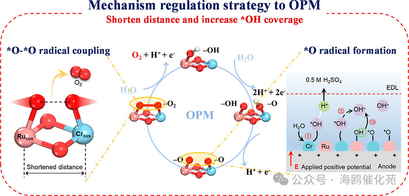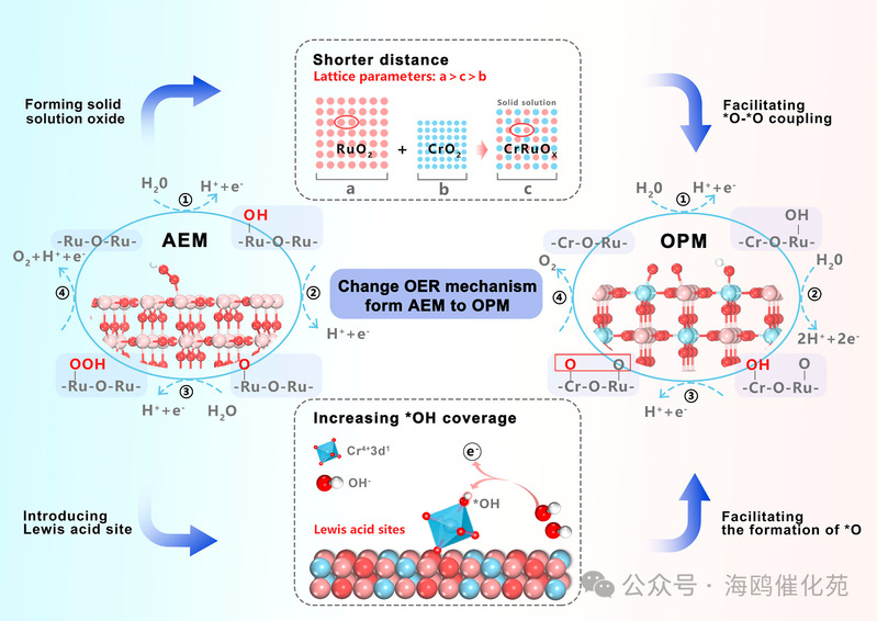 图1. OER机制从AEM转变为OPM的示意图。(蓝色:Cr,粉红色:Ru,红色:O,白色:H)。