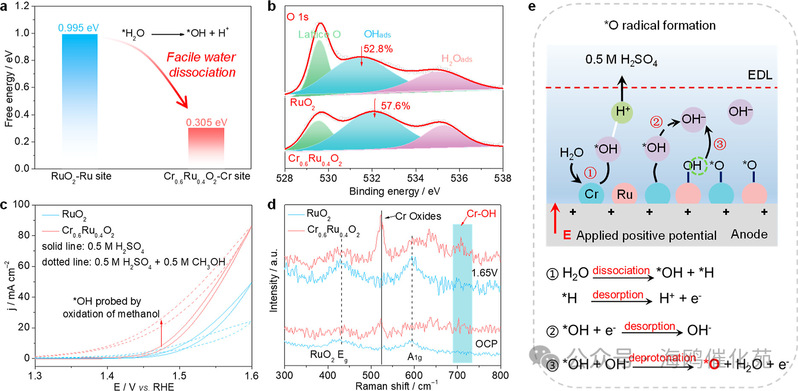 图3. 探究Cr0.6Ru0.4O2催化剂表面的微观环境。(a) 通过密度泛函理论(DFT)计算RuO2中Ru位点和Cr0.6Ru0.4O2中Cr位点上水解离的能量势垒。(b) RuO2和Cr0.6Ru0.4O2的O 1s X射线光电子能谱(XPS)图。(c) RuO2和Cr0.6Ru0.4O2在0.5 M H2SO4溶液中,有无甲醇(0.5 M)条件下的循环伏安(CV)曲线。扫描速率:50 mV/s。(d) RuO2和Cr0.6Ru0.4O2在氧进化反应(OER)过程中的原位拉曼光谱。(e) Cr0.6Ru0.4O2阳极上*O自由基生成的示意图。