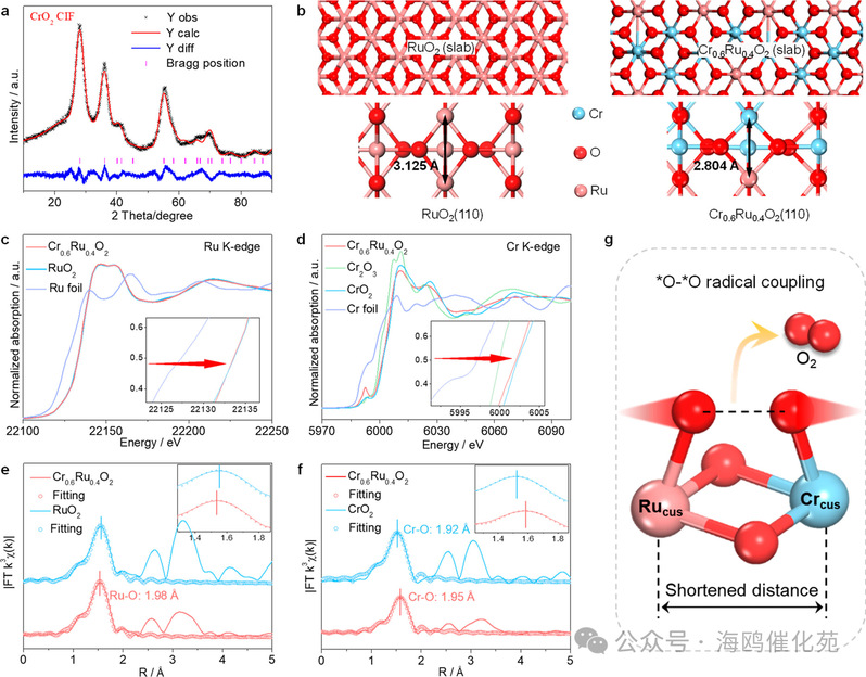 图2. Cr0.6Ru0.4O2固溶体的结构表征。(a) Cr0.6Ru0.4O2的X射线衍射(XRD)图谱的Rietveld精修分析。(b) RuO2片层、Cr0.6Ru0.4O2片层、RuO2 (110)和Cr0.6Ru0.4O2 (110)晶面的晶体结构模型。(c) Ru K边X射线吸收近边结构(XANES)谱图(插图:放大的预边轮廓)以及(e)相应的扩展X射线吸收精细结构(EXAFS)谱图的傅里叶变换(k权重=3)和RuO2与Cr0.6Ru0.4O2的EXAFS拟合(插图:放大的Ru K边XANES谱图的第一导数)。(d) Cr K边XANES谱图(插图:放大的预边轮廓)以及(f)相应的EXAFS谱图的傅里叶变换(k权重=3)和CrO2与Cr0.6Ru0.4O2的EXAFS拟合(插图:放大的Cr K边XANES谱图的第一导数)。(g) 双活性位点距离缩短促进的O-O自由基耦合。CUS,即五个配位O原子的不饱和配位位点。