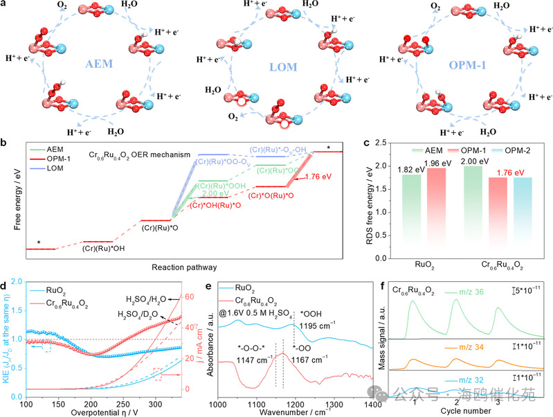 图4. OER机制分析。(a) Cr0.6Ru0.4O2的简化OER机制:AEM、LOM和OPM的示意图。(蓝色:Cr,粉红色:Ru,红色:O,白色:H)。(b) Cr0.6Ru0.4O2表面上OER路径的自由能图。(c) RuO2和Cr0.6Ru0.4O2不同反应路径的速率决定步骤(RDS)能量势垒的比较。(d) 以LSV曲线绘制的动力学同位素效应(KIE)曲线。(e) 在1.6 VRHE条件下,RuO2和Cr0.6Ru0.4O2在OER过程中的原位傅里叶变换红外光谱(FTIR)图。(f) 在1.2至1.6 VRHE电位范围内,使用H218O作为溶剂,Cr0.6Ru0.4O2在三次循环伏安(CV)过程中电解液中O2产物的差分电化学质谱(DEMS)信号。