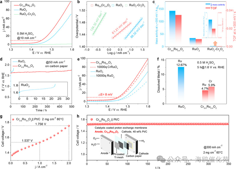 图5. Cr0.6Ru0.4O2的催化性能。(a) 线性扫描伏安(LSV)曲线,(b) tafel图,(c) 表现最佳的Cr0.6Ru0.4O2、RuO2和RuO2-Cr2O3催化剂的周转频率(TOF)和质量活性。(d) 在碳纸上,RuO2和Cr0.6Ru0.4O2在电流密度为50 mA cm–2时的恒电位计时稳定性测试。(e) Cr0.6Ru0.4O2和RuO2在经过10,000次循环伏安(CV)循环后的LSV曲线和稳定性测试。(f) 在1.6 VRHE电位下进行5小时恒电位计时测试后,RuO2和Cr0.6Ru0.4O2的金属溶解情况。(g) 使用Cr0.6Ru0.4O2作为阳极催化剂和商业Pt/C作为阴极催化剂的质子交换膜水电解(PEMWE)装置的极化曲线,以及(h)恒电位计时曲线,所有电池电压均未进行iR补偿。(h)插图为PEMWE装置的示意图。