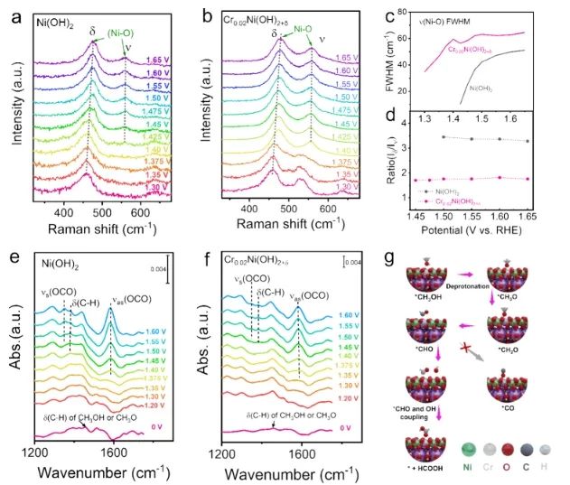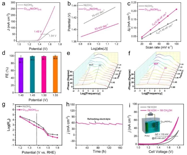 通过改变带电界面上的局部碱度和H2O分布,最优的Cr0.02Ni(OH)2+δ催化剂具有较低的起始电位(1.34 VRHE),并且在1.45 VRHE下达到50 mA cm-2的电流密度。同时,Cr0.02Ni(OH)2+δ能够在1.45 VRHE下连续稳定运行160小时(约15%电流损失);在整个MOR过程中,活性相中Cr始终存在,尽管随着时间的推移经历了部分溶解。