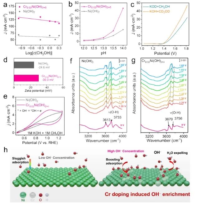 具体而言,Cr修饰的Ni(OH)2表现出疏水性,排斥吸附的H2O分子,这一特性解决了催化剂界面上H2O分子占据金属活性中心导致MOR活性降低的问题。此外,Cr掺杂还有效地调节了H2O的解离动力学,增强了带电界面上OH−的富集,通过将热力学势垒从2.52降低到1.59 eV,促进了CH3OH的加速解离。