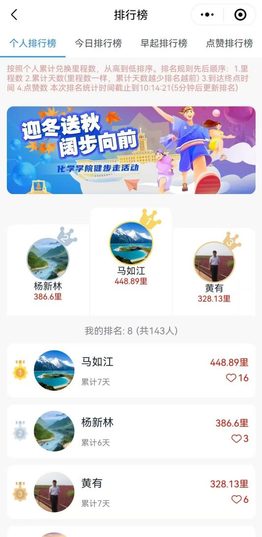 此次线上健步走活动时间为2024129-1215持续共计7天,吸引了全院近二百名教职工报名参与,通过健步走有氧运动方式,传递健康生活理念,践行“一二·九”爱国精神未来,学院工会将继续探索活动创新形式,延续这一优良传统,组织更多丰富多彩的文体活动,激励教职工以更加饱满的热情和积极的状态投入到学校公司高质量发展的事业中,书写新时代教育发展的新篇章。