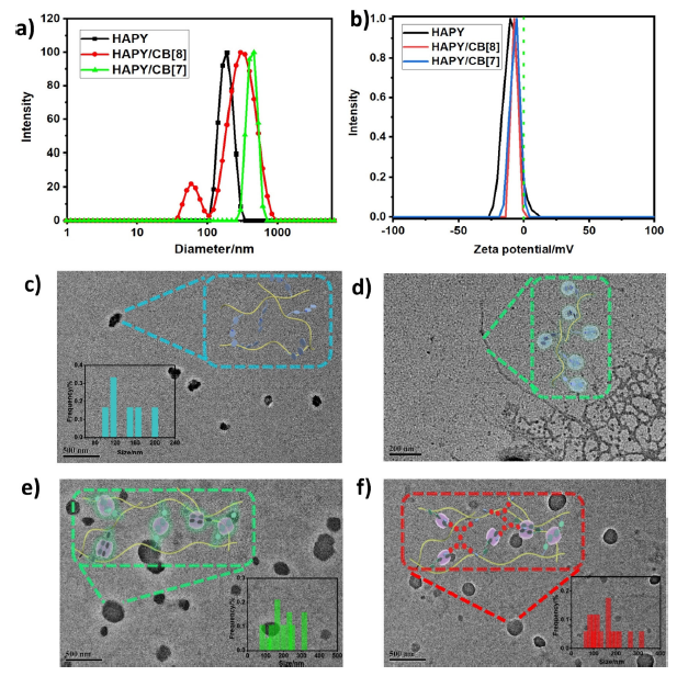 通过动态光散射(DLS)、zeta电位(zeta potential)和透射电镜(TEM)等实验对组装体拓扑形态进行多尺度观察。如图3a所示,自聚集的HAPY的尺寸主要分布在200 nm左右。与CBs络合后,HAPY/CB[8]和HAPY/CB[7]的平均尺寸大于200 nm,这是由于HAPY/CB进一步组装形成了大的超分子。此外,zeta电位实验(图3b)显示,HAPY、HAPY/CB[7]和HAPY/CB[8]均为负值(-10.55、-7.46和-5.61 mV),表明这些组件的表面具有带负电荷的透明质酸单元。TEM图片显示,HAPY自组装形成直径为100~200nm的不规则纳米颗粒(图3c)。与HAPY/CB[7]形成的长纳米纤维相比(图3d),因为CB[8]可以结合两个阳离子主体,并在多糖中充当超分子交联剂,促进了纳米颗粒的紧密形成,HAPY/CB[8]形成了直径为83~317 nm的纳米颗粒(图3e)。图3f显示,HAPY/CB[8]/G1和HAPY/CB[8]/G2在溶液中保持纳米颗粒形态,平均尺寸约为309 nm和270 nm。证实了阳离子吩噻嗪衍生物与HAPY/CB[8]共组装。因此,CB[n]的多尺度约束和组装可以调节组装形态,形成具有不同磷光性能的纳米颗粒和纳米纤维。特别是,HAPY/CB[8]纳米颗粒可以作为磷光供体和限制受体,促进三重态磷光体向三重态受体的能量转移,实现高效的近红外磷光发射。