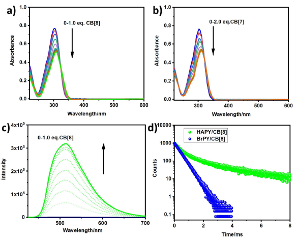 首先,合成了透明质酸修饰的溴苯基吡啶(HAPY)和模型化合物(BrPY),并通过溴化、偶联和季铵化反应合成两种四阳离子双吩噻嗪。选择BrPY作为模型化合物,研究了CB[n]与HAPY发光团之间的结合行为。随后,进行了发光团的UV-vis滴定实验,以探索CBs与BrPY的结合行为。从图1a可以看出,随着CB[8]浓度的增加,BrPY的吸收峰从305 nm红移到310 nm;同时吸收强度逐渐降低,这是由于CB[8]的包封造成的。通过紫外-可见光谱滴定实验测定了CB[7]与BrPY的结合常数(图1b),计算结果为2.30 × 106 M-1。因此,BrPY可以被CB[7]或CB[8]以不同的结合方式包裹,形成稳定的超分子复合物。通过光致发光实验,探讨了CBs约束对溴苯基吡啶衍生物发光行为的影响。从图1c可以看出,HAPY中没有出现明显的磷光信号,随着CB[8]的加入,510 nm处的发射信号逐渐增加;因此,长寿命的发射峰属于超分子的磷光信号。510 nm处发射峰的寿命为366.69 μs(图1d),不包括其短寿命荧光峰。与BrPY/CBs相比,在CB[8]和CB[7]的约束下,HAPY的磷光寿命更长(1.27 ms和51.49 μs),表明HAPY的多糖结构有利于高效磷光发射。