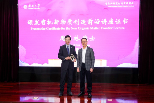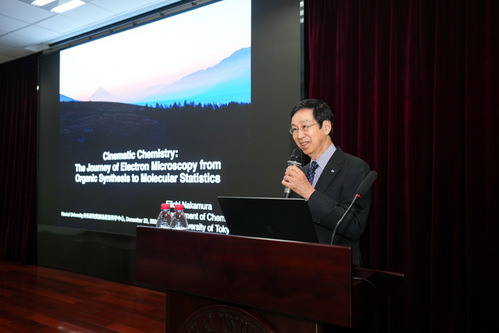 仪式后,中村荣一做客在石先楼报告厅举行的“有机新物质创造前沿讲座”,并带来“影像化学:电子显微术从有机合成到分子统计的发展历程”的精彩学术报告。报告中,他介绍了一种源自单分子原子分辨率时间分辨电子显微术(SMART-TEM)的新“影像化学”范式,并通过列举实例对其作了生动的阐释,为在场师生带来了全新的研究视角与创新视野。