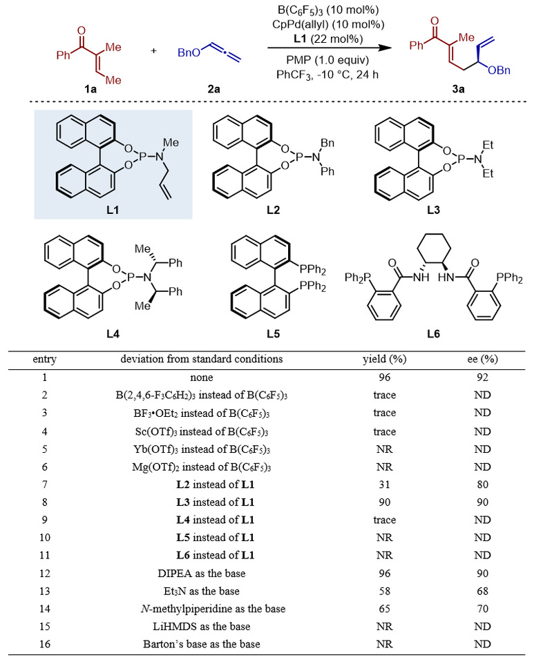 基于此设想,作者对反应条件展开了研究。通过细致筛选,作者发现以B(C6F5)3和CpPd(allyl)/L1为催化剂,1,2,2,6,6-五甲基哌啶 (PMP) 为碱,能够以高收率和高立体选择性得到目标产物3a。B(C6F5)3强的路易斯酸性和大的空间位阻对于反应至关重要,换为酸性较弱的B(2,4,6-F3C6H2)3或者位阻较小的BF3•OEt2,反应均不能发生。碱的种类对反应影响较大,使用位阻较大的碱N,N-二异丙基乙胺(DIPEA),反应效果与PMP类似。而使用位阻较小的Et3N 和N-methylpiperidine,收率和对映选择性均有所下降,这可能是碱与硼/钯催化剂配位导致的。强碱Barton’s base 和 LiHMDS 均未能引发该反应,推测原因在于其共轭酸无法释放质子(图2)。