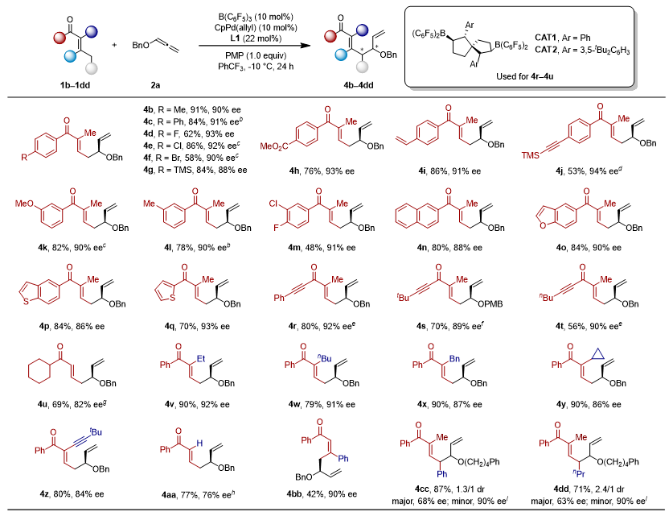 受此前过渡金属催化剂与有机催化剂或路易斯酸催化剂联用实现立体发散合成的启发,作者尝试结合手性螺环双硼催化剂与手性钯催化剂,探索立体发散合成。在烯酮1ee与联烯2a的反应中,手性螺环双硼催化剂可控制产物γ位手性,而手性金属钯催化剂可控制δ位手性,实现了立体发散合成(图5)。