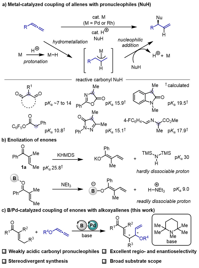 过渡金属催化不饱和烃(涵盖炔烃、1,3-二烯以及联烯)与前亲核试剂之间的偶联反应,是合成烯丙基取代化合物的重要途径。该类反应在天然产物、药物以及其他生物活性分子的合成中广泛使用。其反应机理如下(图1a):首先,低价金属催化剂与质子反应生成金属氢物种;接着,该金属氢物种与不饱和烃进行氢金属化反应,形成烯丙基金属中间体;最后,此中间体被亲核试剂捕获,得到烯丙基化产物。