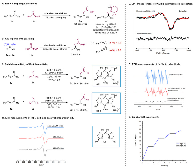 为了阐明C(sp3)-H键与羧酸氧化偶联的反应机理,作者利用2,2,6,6-四甲基哌啶氮氧化物(TEMPO)进行了自由基捕获实验。TEMPO对反应的抑制效果表明自由基参与了反应过程。通过动力学同位素效应实验发现,这两种反应的kH/kD比值分别为3.1和3.3,表明C(sp3)-H键的氢原子解离可能是速率决定步骤。使用预先制备的中间体CuII-OtBu和CuII-OBz(分别记为Int-I和Int-II)催化反应,成功获得了目标产物,从而证实了反应过程中形成了这些中间体。通过一系列电子顺磁共振(EPR)测量,证明反应中的自由基及中间体Int-I和Int-II的存在。此外,原位制备的催化剂EPR光谱测定也显示了Cu(II)中间体的存在。值得注意的是,作者在10 K条件下通过平行模式的EPR光谱实验检测到了典型的S = 1信号,并对此信号进行了详细拟合。结果表明,这个S = 1信号可能来源于Cu(III)中间体。作者还通过EPR分析确认了叔丁氧自由基主要由DTBP的光解产生。最后,通过开关灯实验确认,反应并非通过自由基链式反应机制进行。