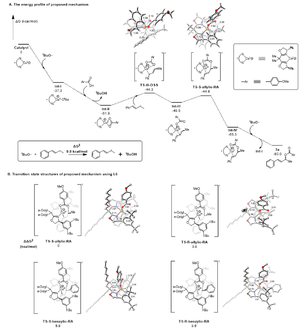 为了进一步深入研究反应机理,作者还进行了密度泛函理论(DFT)计算。首先,Cu(I)络合物与光分解DTBP产生的叔丁氧自由基反应,形成中间体Int-I;接着,该中间体与羧酸发生配体交换,生成中间体Int-II。随后,由叔丁氧自由基攫氢产生的烯丙基自由基与中间体Int-II反应得到关键的Cu(III)中间体Int-III。进一步该中间体通过外球模式还原消除,形成C-O键,得到中间体Int-IV。随后,中间体Int-IV解离生成目标产物。整个反应过程,生成烯丙基自由基需要克服9.8 kcal/mol的能垒,这一步骤是整个机理中的速率控制步骤,符合动力学同位素效应的实验结果。当使用L6配体时,过渡态TS-R-allylic-RA和TS-S-benzylic-RA的能量分别比TS-S-allylic-RA高出3.9和5.8 kcal/mol,计算所得的对映选择性和区域选择性与实验结果一致。DFT模拟还阐释了BArF–作为抗衡阴离子在Cu(I)中心形成空配位的重要性;如果Cu(I)中心被Cl–占据,则会显著提高整体反应的能垒,导致反应收率下降。