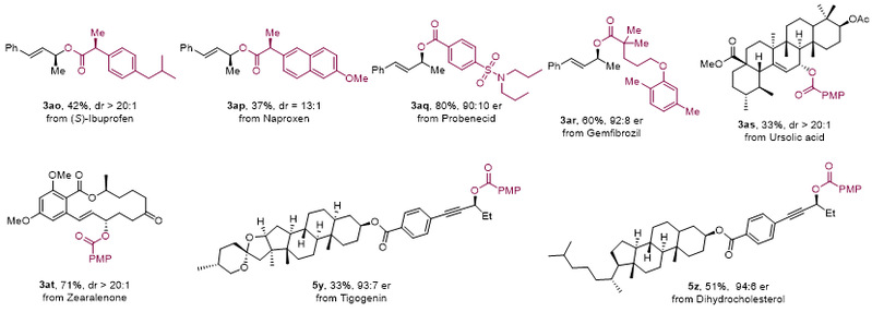 为了展示他们开发的方法在有机合成中的潜在应用,作者将此反应应用于生物活性分子的衍生化。通过这些示例,展现了从烯烃和炔烃直接合成手性酯的实用性,以及其在生物活性分子后期结构修饰中的应用价值。