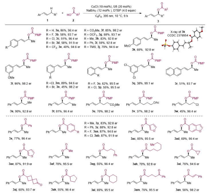 图2. 烯烃与羧酸不对称氧化偶联反应底物范围。图片来源:J. Am. Chem. Soc.