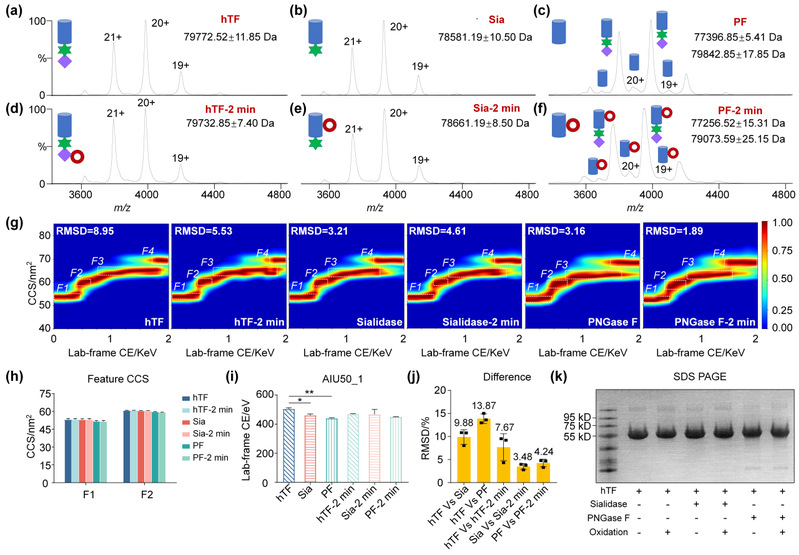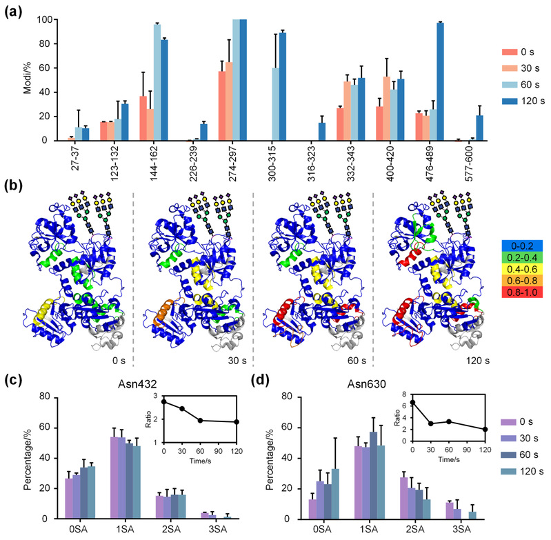 进一步的研究以人转铁蛋白(hTF)为模型,结合酶学处理、离子淌度质谱(IM-MS)和液相色谱-串联质谱(LC-MS/MS),揭示了唾液酸化修饰如何通过特定的糖基化模式显著增强蛋白质在氧化应激下的结构稳定性。研究表明,唾液酸化修饰不仅能通过直接与活性氧(ROS)反应减少自由基对蛋白质主链的攻击,还能通过糖基屏蔽效应保护特定的蛋白质区域免受氧化损伤。