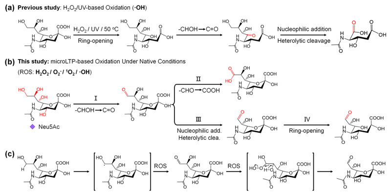 本研究团队设计了一种微尺度低温等离子体(microLTP)装置,模拟了细胞中复杂的氧化应激环境,并结合高分辨率质谱分析和密度泛函理论(DFT)计算,首次完整绘制了两种常见唾液酸(Neu5Ac 和 Neu5Gc)在自由基氧化条件下的氧化路径图。研究发现,唾液酸的氧化过程呈现出独特的“逐步侧链氧化“模式,而非传统化学反应中常见的糖环断裂。这一新发现为唾液酸在保护蛋白质结构稳定性方面的作用提供了分子水平的解释。