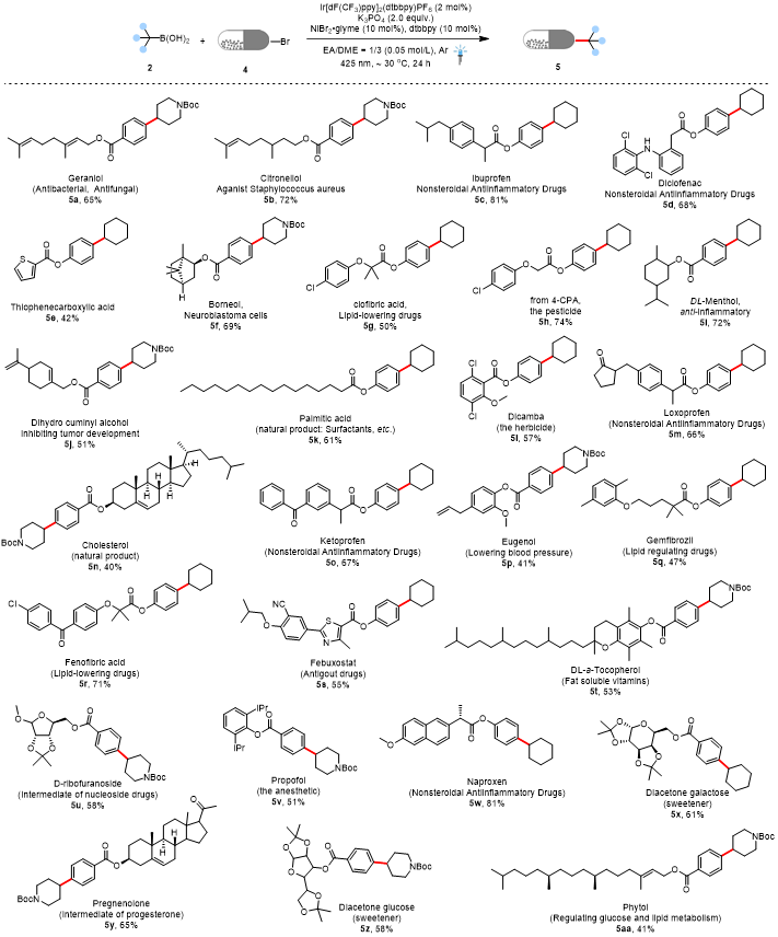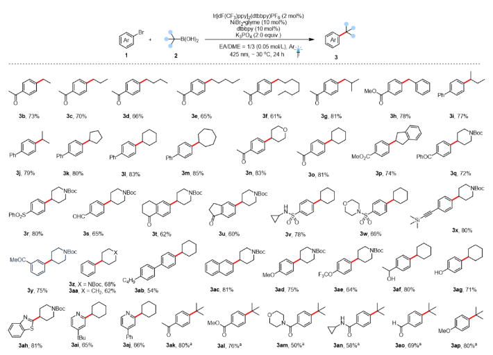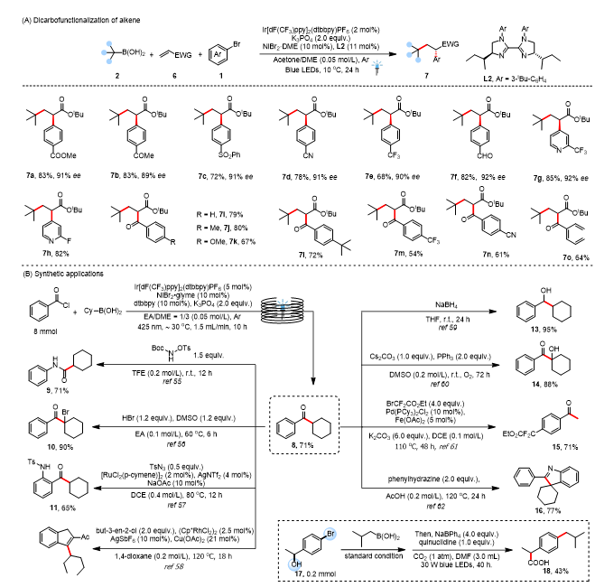 事实上,作者在此报告一种通过光氧化还原/镍双催化实现游离烷基硼酸与芳基溴之间脱硼自由基交叉偶联反应的方法。作者使用磷酸钾(K3PO4)来降低烷基硼酸的氧化电位,使其能够参与光催化循环,且无需任何额外的反应组分。作者的方法展现出良好的官能团耐受性,温和的反应条件允许对药物分子进行官能团化。此外,该方法可用于烯烃的三组分碳酰化/碳芳基化反应。具体而言,作者通过使用手性双咪唑啉配体实现了烯烃的对映选择性三组分碳芳基化。另外,作者采用一锅两步法对1-(4 -溴苯基) 乙醇的两个反应位点进行修饰,直接合成了布洛芬。