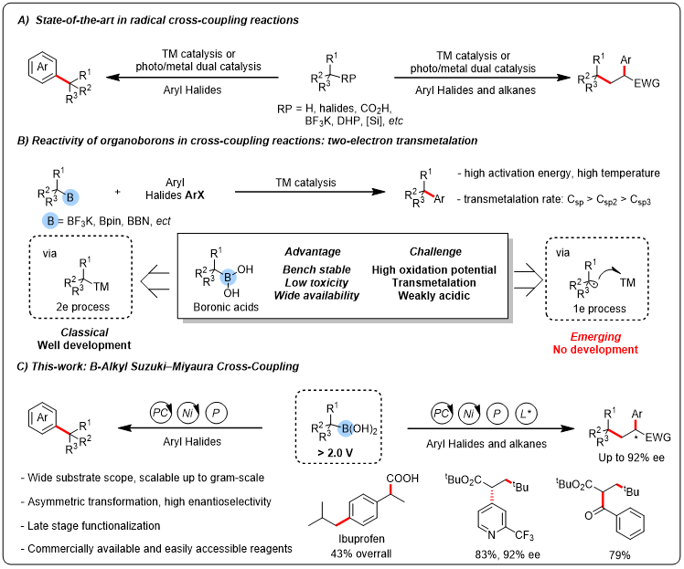过渡金属催化交叉偶联反应,推动了药物和农用化学品合成。但引入C(sp3)杂化片段仍是难题。硼中心的Suzuki–Miyaura(SMC)交叉偶联反应可有效构建C(sp2)-C(sp2)键,具备官能团耐受性好、硼副产物毒性低等优势(图 1B)。不过,将其用于C(sp3)键时仍面临诸多挑战,如氧化加成和过渡金属化速率低、烷基金属中间体易发生 β-氢消除,并且该反应需使用对空气和水分敏感的有机金属化合物、高温及长时间反应,限制了实际应用。因此,开发温和、选择性的硼-烷基SMC反应意义重大。