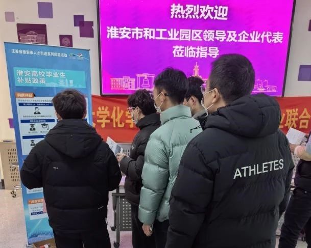 高层次人才招聘活动在主会场外同步进行,招聘会现场气氛热烈,来自淮安工业园区的八家优质企业设置招聘席位,吸引了大批化学、材料等专业的本、硕、博应届毕业生。企业招聘人员热情地向同学们介绍企业的发展前景、岗位需求、福利待遇等情况,同学们积极响应国家就业政策,踊跃参与招聘,就企业发展、岗位晋升及淮安市“购房补贴+安家费”等相关人才政策与招聘人员展开咨询。