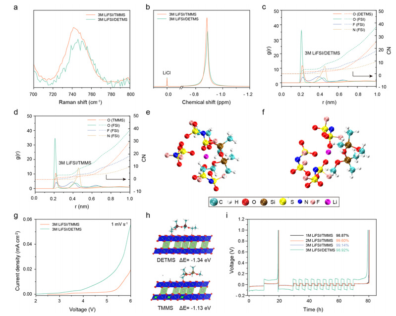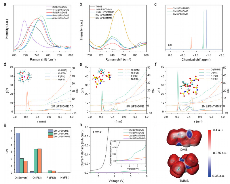 图3. TMMS和DME基电解液的溶剂化结构。a. 不同浓度DME基电解液的拉曼图谱;b. 不同浓度TMMS基电解液的拉曼图谱;c. 三种电解液的⁷Li核磁共振谱;d. 2 M LiFSI/DME的Li⁺径向分布函数g(r)、配位数CN(r)及Li⁺溶剂化结构示意图;e. 5 M LiFSI/DME的Li⁺径向分布函数g(r)、配位数CN(r)及Li⁺溶剂化结构示意图;f. 2 M LiFSI/TMMS的Li⁺径向分布函数g(r)、配位数CN(r)及Li⁺溶剂化结构示意图;g. 使用不同电解液的Li||Al电池的线性扫描伏安(LSV)曲线;h. DETMS和TMMS分子的平均局部电离能(ALIE);i. DETMS和TMMS分子的ALIE。