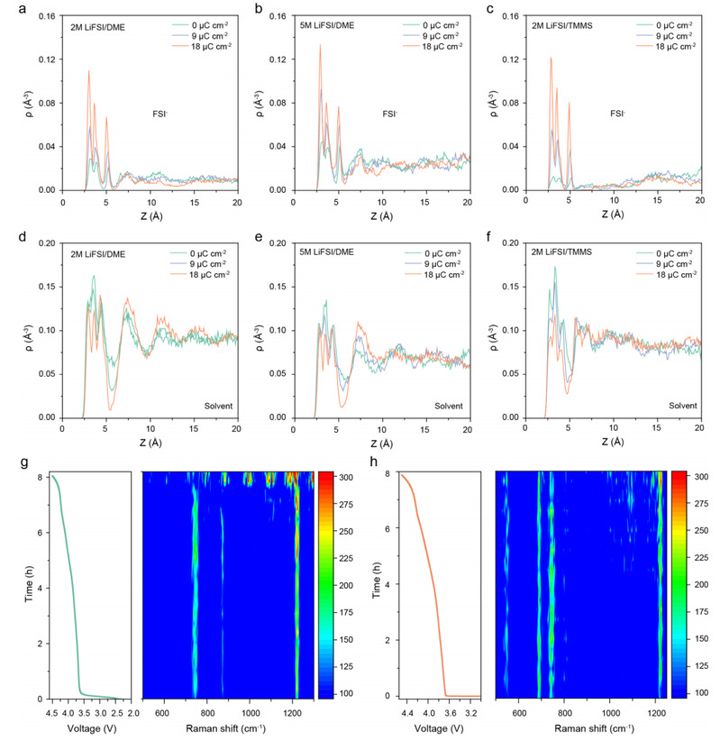 图4 不同电解液的演变。(a−c). 2 M LiFSI/DME(a)、5 M LiFSI/DME(b)和2 M LiFSI/TMMS(c)中FSI⁻离子数密度随正电极石墨电极电荷密度的变化;(d−f). 2 M LiFSI/DME(d)、5 M LiFSI/DME(e)和2 M LiFSI/TMMS(f)中溶剂分子数密度随正电极石墨电极电荷密度的变化;g. 使用5 M LiFSI/DME的NCM811||Li电池的原位拉曼图谱;h. 使用2 M LiFSI/TMMS的NCM811||Li电池的原位拉曼图谱。