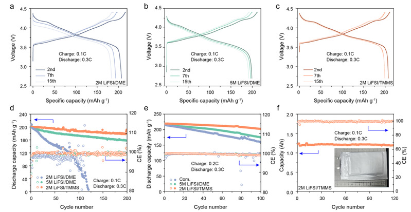 图6 电化学性能。 a. 使用2 M LiFSI/DME的NCM811||Li全电池的充放电曲线; b. 使用5 M LiFSI/DME的NCM811||Li全电池的充放电曲线;c. 使用2 M LiFSI/TMMS的NCM811||Li全电池的充放电曲线;d. 使用2 M LiFSI/DME、5 M LiFSI/DME和2 M LiFSI/TMMS的NCM811||Li全电池的循环稳定性和库仑效率;e. 在50℃下,使用商业电解液、5 M LiFSI/DME和2 M LiFSI/TMMS的NCM811||Li电池的循环稳定性;使用2 M LiFSI/TMMS的NCM811||Li软包电池的循环性能。