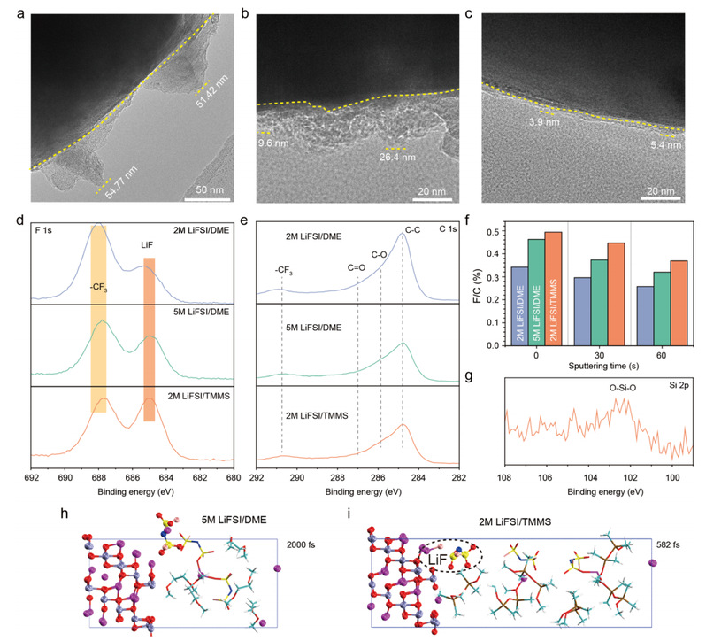 图5 在不同电解液中循环的NCM811正极的界面层表征。(a−c). 使用2 M LiFSI/DME(a)、5 M LiFSI/DME(b)和2 M LiFSI/TMMS(c)循环50次后的NCM811正极的高分辨透射电镜(HRTEM)图像;d. 使用三种不同电解液循环后的NCM811正极的XPS F 1s谱;e. 使用三种不同电解液循环后的NCM811正极的XPS C 1s谱;f. 使用三种不同电解液循环后的NCM811正极的F/C比;g. 使用2 M LiFSI/TMMS循环后的NCM811正极的XPS Si 2p谱;h. 5 M LiFSI/DME的AIMD模拟快照;i. 2 M LiFSI/TMMS的AIMD模拟快照。