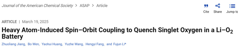 Jiang, Z., Wen, B., Huang, Y., Wang, Y., Fang, H., & Li, F. Heavy Atom-Induced Spin–Orbit Coupling to Quench Singlet Oxygen in a Li–O2 Battery. Journal of the American Chemical Society, 2025.