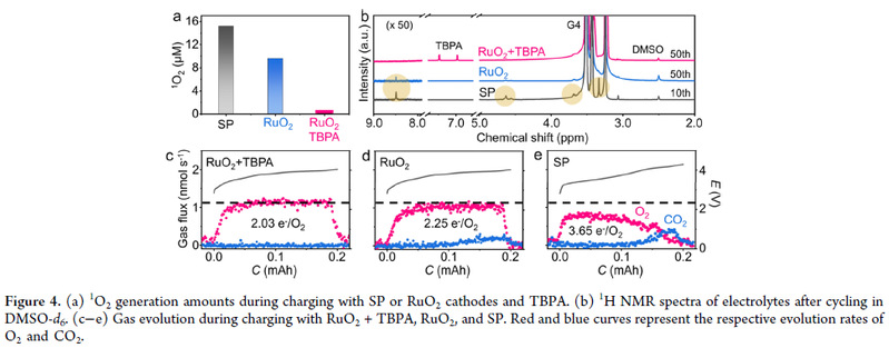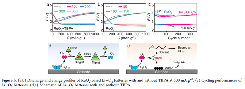 与传统催化剂(如RuO₂)结合使用时,TBPA作为添加剂能大幅降低充电过电压,并延长电池的循环寿命,Li-O₂电池在350次循环后仍保持高效能,显示出比传统电池系统更优异的稳定性和可逆性。