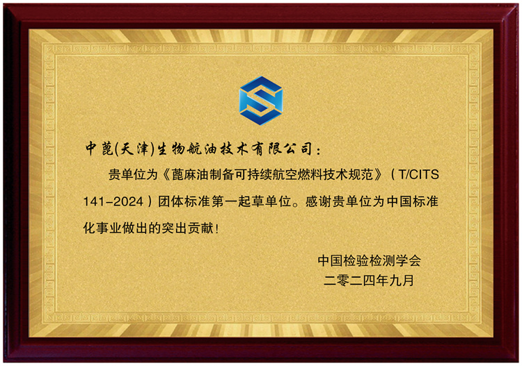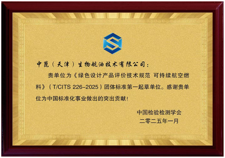 这几天,在天开园6号楼,中蓖(天津)生物航油技术有限公司的技术总监刘思阳收到了中国检验检测学会为他们团队颁发的证书,感谢他们作为《绿色设计产品评价技术规范 可持续航空燃料》团体标准第一起草单位,为中国标准化事业做出的突出贡献,而这,已经是他们团队牵头起草的第四份团体标准了。