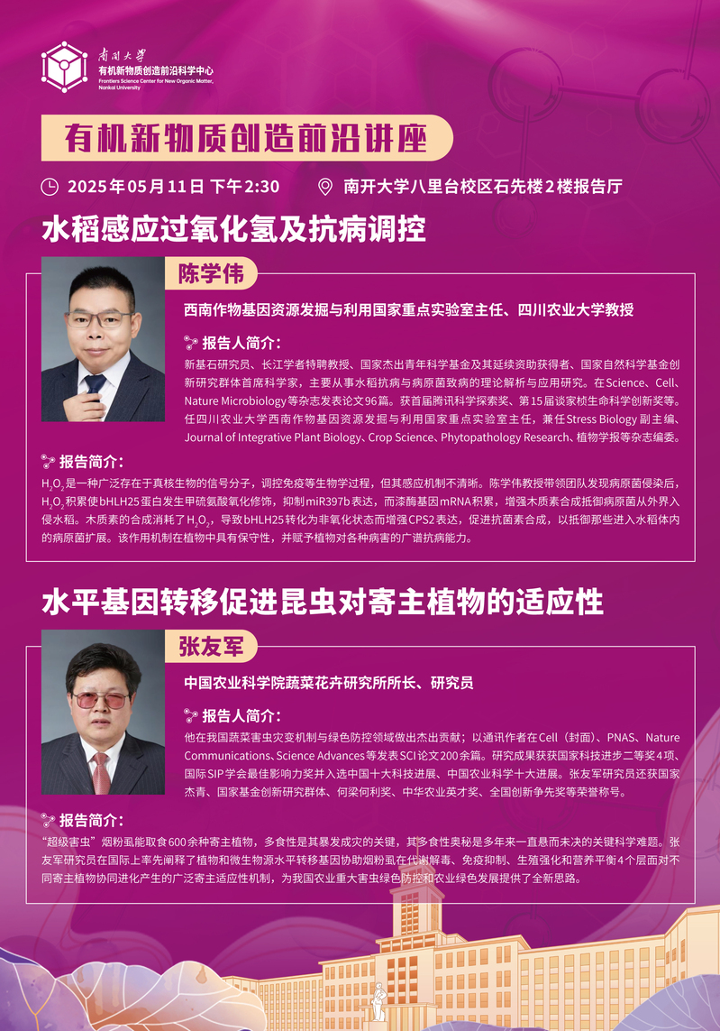 有机新物质创造前沿讲座:水稻感应过氧化氢及抗病调控、水平基因转移促进昆虫对寄主植物的适应性