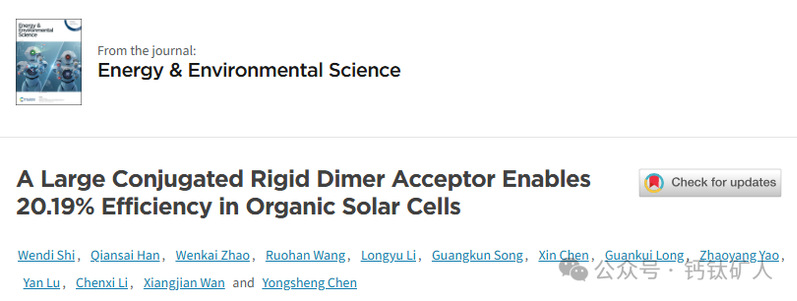 W. Shi, Q. Han, W. Zhao, R. Wang, L. Li, G. Song, X. Chen, G. Long, Z. Yao, Y. Lu, C. Li, X. Wan and Y. Chen, Energy Environ. Sci., A Large Conjugated Rigid Dimer Acceptor Enables 20.19% Efficiency in Organic Solar Cells,2025, DOI: 10.1039/D5EE00878F.