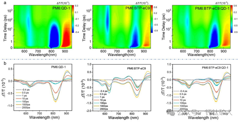 图5:(a) 在 800 nm 激光激发下,PM6:QD-1、PM6:BTP-eC9 和 PM6:BTP-eC9:QD-1 混合薄膜的fs瞬态吸收光谱的彩色二维图。(b) 在800 nm 激光激发下,PM6:QD-1、PM6:BTP-eC9和 PM6:BTP-eC9:QD-1 混合薄膜在指定延迟时间下的代表性fs瞬态吸收光谱。