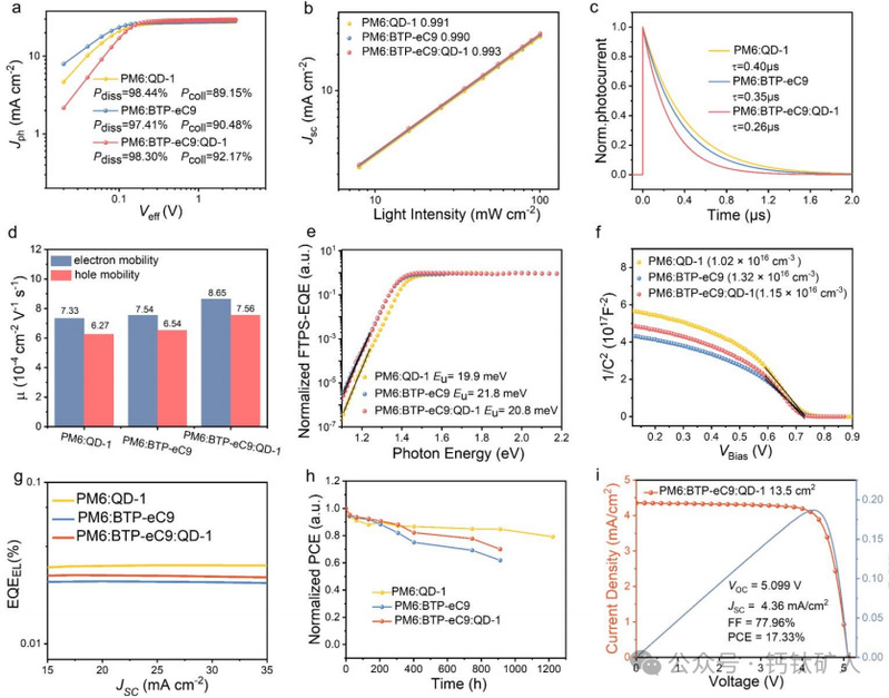 图3:(a) Jph与Veff曲线,指示Pdiss和Pcoll。(b) Jsc随光强(Plight)的变化关系。(c) 二元和三元器件的瞬态光电流测量。(d) 通过单载流子器件获得的 PM6:QD-1、PM6:BTP-eC9 和 PM6:BTP-eC9:QD-1 混合物的电子和空穴迁移率。(e) PM6:QD-1、PM6:BTP-eC9 和 PM6:BTP-eC9:QD-1 器件在吸收边处的 FTPS-EQE。(f) Mott-Schottky 图(虚线表示线性拟合)。(g) 优化后的 OSCs 的相应EQEEL光谱。(h) 在氮气手套箱中 65℃下未封装的基于PM6:QD-1、PM6:BTP-eC9 和 PM6:BTP-eC9:QD-1 OSCs 的热稳定性测试。(i) PM6:BTP-eC9:QD-1 模组的J-V和P-V曲线。