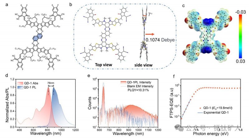 图1:(a) 化合物 QD-1 的化学结构。(b) 通过DFT计算优化的 QD-1 分子构型(B3LYP/6–31G水平)。(c) QD-1 的静电势能等值面图。(d) QD-1薄膜的紫外-可见吸收光谱在640 nm波长下激发的光致发光(PL)光谱。(e) QD-1 薄膜的光致发光量子产率。(f) 基于 QD-1 的器件在吸收边处的FTPS-EQE。