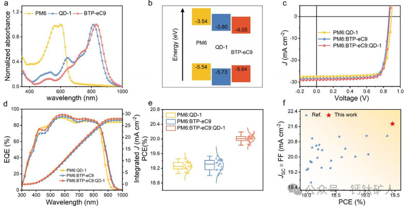 图2:(a) 固态薄膜中 PM6、BTP-eC9 和 QD-1 的归一化吸收光谱。(b) 能级排列。(c) OSCs的J-V曲线。(d) EQE曲线及积分的Jsc。(e)基于 PM6:QD-1、PM6:BTP-eC9 和 PM6:BTP-eC9:QD-1 的 OSCs PCE统计直方图。(f) 二元 OSCs 的Jsc与FF的乘积随 PCE 的变化关系,数据点来源见表 S3。