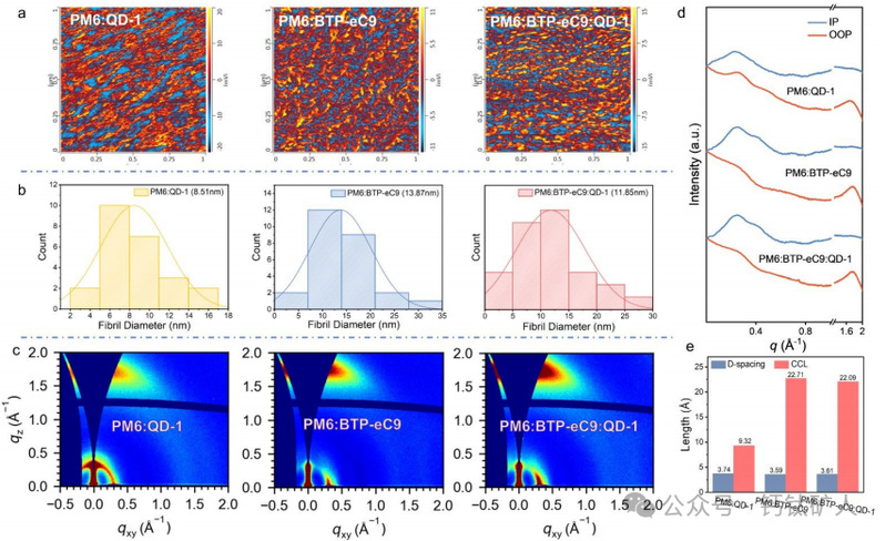 图4:(a) 通过测量受体的 2216 cm⁻1信号获得的三种混合薄膜的AFM-IR相位图像,其中给体和受体区域分别用蓝色和红色标记。(b) 纤维直径的统计分布。(c) 三种混合薄膜的二维GIWAXS图。(d) 从二维 GIWAXS 图中提取的线切图。(e) 混合薄膜中 π-π 堆叠方向(010)的 d-间距和晶体相干长度(CCL)。