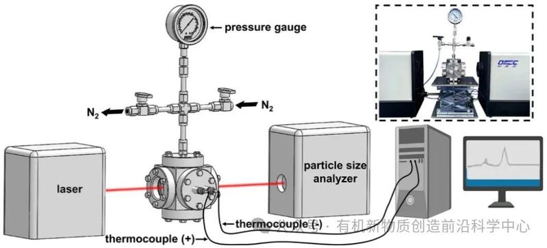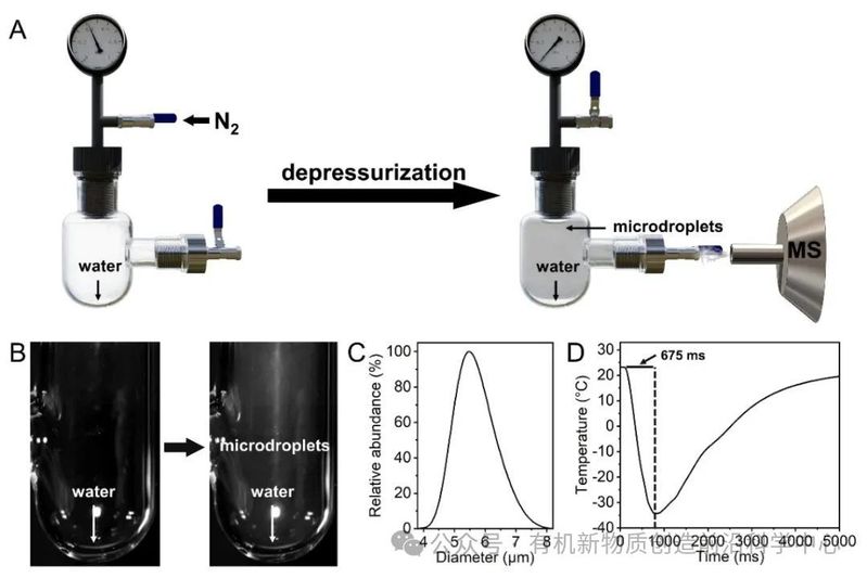 为了探究绝热膨胀过程中产生的液滴粒径和温度,作者搭建了如图2所示的实验装置。液滴在封闭的不锈钢六通腔体中产生,激光喷雾粒度仪的激光从侧面穿过观察窗,测得绝热膨胀产生的微液滴尺寸范围为4-8 μm(图1C)。同时,通过过线柱将超细快速反应热电偶(直径0.05 mm)接入六通方体腔内部,测得膨胀过程中产生的微液滴处于过冷状态(-34.4 ℃)(图1D)。