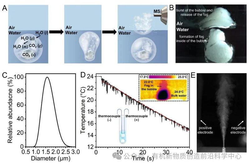 图3A展示了本文的第二种微液滴发生方式,即将干冰放置于水中。尽管将干冰扔到水中产生大量白雾是日常生活中十分常见的现象,该现象背后的原理却鲜有人知。首先,干冰放入水中会迅速升华为干燥的气态CO2,形成一个包裹干冰的大气泡,并将干冰与外界水体隔绝。与CO2气泡接触的液态水(H2O(l))会迅速以水蒸气形式(H2O(g))挥发至CO2气泡中。由于气泡内部温度较低,水蒸气又被迅速冷凝生成微液滴(H2O(m))。作者利用高速摄像机拍摄了微液滴的动态生成过程(图3B和视频2)。高速摄影表明干冰产生的白雾来源于溶液中体相水汽化后的再凝结。经激光喷雾粒度仪测试,干冰放入水中产生的微液滴尺寸范围为1-2.8 μm(图3C)。