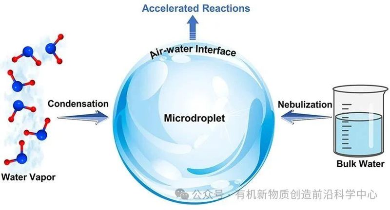 近年来液滴化学发展迅速,许多原本在体相水溶液中难以进行的化学反应,通过微液滴可以自发发生;许多在体相水溶液中反应速率慢的反应,在微液滴中可以被加速多个数量级。微液滴的一系列独特性质,如极端pH、部分溶剂化、试剂的富集和统一取向排列、超高电场等被认为是反应加速的原因,其中最有趣的性质是在微液滴表面自发形成的超高电场(~109 V/m)。