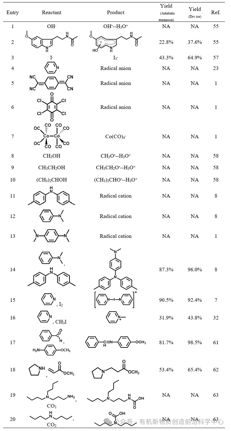 作者利用上述两种方法产生的未活化的微液滴,测试了一系列经典的微液滴化学反应。这些微液滴反应具体可以分为四类:•OH和电子在微滴上的生成和捕获(Entry 1-7),化学物质失去电子被氧化的反应(Entry 8-14),被电场加速的反应(Entry 15-16),以及与亲核加成相关的有机反应(Entry 17-20)。测试结果如表1所示。