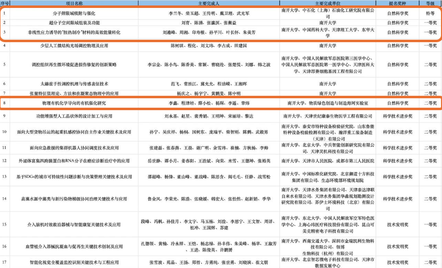 近日,2024年度天津市科学技术奖评选结果揭晓,南开化学科研团队5项成果获奖,作为第一完成单位获得4项,创历史新高,包括特等奖1项,一等奖2项,二等奖1项,彰显了化学学科在基础研究和技术创新领域的强劲实力。